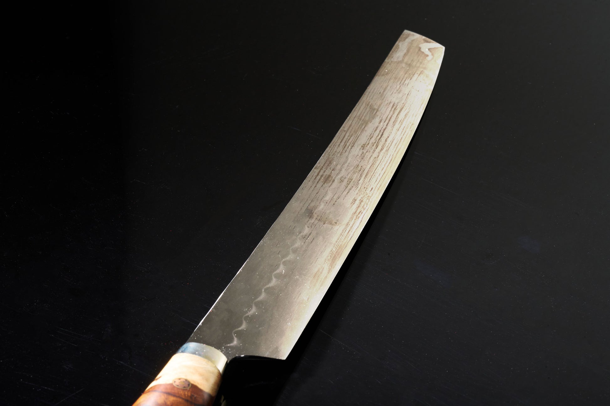 This product is meticulously crafted by Japanese living national treasure-level bladesmith IKEDA YOSHIKAZU. The use of Shirogami 3 steel material not only significantly enhances the cost-effectiveness of the product but also greatly improves the effect of the clay tempering technique, making the hamon pattern more distinct and attractive. In addition, it features a high-quality handcrafted sand-ironwood handle, adding to its overall elegance. Finally, with the precise sharpening in a professional blade grinding workshop, this kitchen knife achieves an exceptionally high level of cost-effectiveness. As an entry-level honyaki kitchen knife, it is undoubtedly an excellent choice.