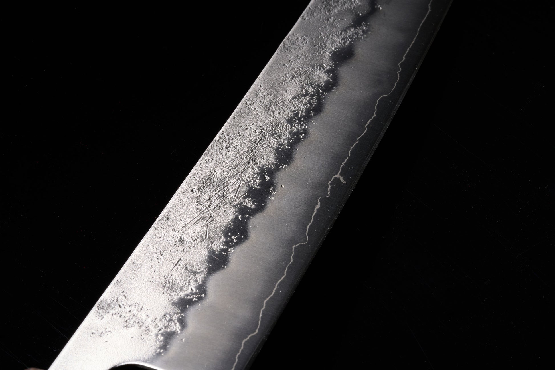 Regarding the daily maintenance of Japanese kitchen knives:1、The forging technique of Japanese kitchen knives has evolved from traditional Japanese swords, giving them superior sharpness and hardness, making them excellent for cutting and slicing tasks. Most food ingredients commonly purchased in Japan, such as fish, chicken, beef, and pork, are often already processed into boneless or meat-only forms. Consequently, the need for chopping and cleaving is rare in most Japanese culinary scenarios. Therefore, Japanese kitchen knives are not designed for heavy chopping, and it is advisable not to attempt to cut or chop frozen foods and bones, as it may lead to blade damage.2、If your kitchen knife is made from carbon steel, it is essential to wash the knife after use and thoroughly dry it to prevent moisture retention. This is especially important as carbon steel blades are prone to rust if not properly maintained. From a hygiene standpoint, it is also recommended to keep stainless steel knives clean. If you plan to store your knife for an extended period without use, we suggest applying a layer of knife oil (olive oil is also suitable) and wrapping the blade with rust-resistant paper (newspaper is acceptable).